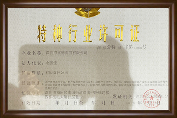深圳本土老字號品牌,誠信經營,專注民品典當21年,國家正規合法持金融牌照典當行機構。